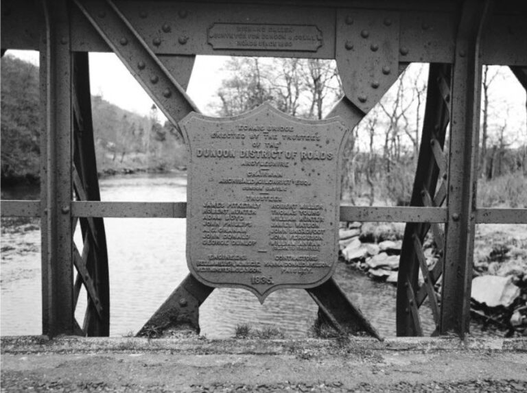 “Eachaig Bridge – Erected by the Trustees of the Dunoon District of Roads, Argyllshire. Chairman – Archd. Gilchrist, Esq, Dunoon Castle, Trustees – James Pitkethly, Robert Hunter, Adam Boyd, John Phillips, A.G. Graham, John Donald, George Dunlop, Robert Miller, Thomas Young, William Hunter, James Watson, John Broadfoot, John Ferguson, William Annan (Clerk to Trustees). Engineers Bell & Miller M.M.I.C.E., Westminster and Glasgow. Contractors – Hannah, Donald and Wilson, Paisley. – 1885”
