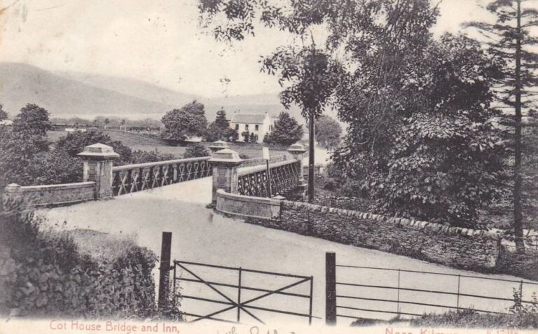 For centuries the principal means of travel to and around Cowal was by water. There were no roads as such, just tracks for ponies, cattle or walkers crossing the difficult terrain. Loch Eck cuts across the important route between Inveraray and the Clyde, made difficult by geography, and provides an easier passageway to Loch Fyne and beyond. It was this route which was taken by Mary Queen of Scots on her journey from Inveraray to Dunoon in 1563. It was essential to have the means to cross the river Eachaig, and a small ferry was provided near the inn on the west bank of the river. This small boat or punt was named a COITE, and passengers were charged a small fee – reputedly a halfpenny. This facility gave the small thatched house by the river where the ferryman lived the name of Cot House. Not one to pass the opportunity of earning some extra money, the ferryman soon began supplying thirsty passengers with home brewed beer, and it is believed that something stronger was also available. It does not take a leap of the imagination to picture smugglers sitting cosily by the fire in the small inn enjoying a dram or two.